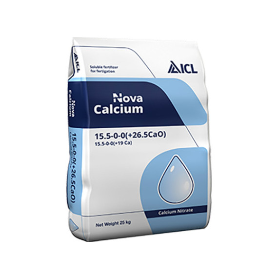 El fertilizante Nova Calcium 15,5-0-0+26,5CaO es una magnífica fuente hidrosoluble de nitrógeno y calcio, que se presenta en una forma de fácil absorción. Mejora la calidad integral de frutas y hortalizas y ayuda a aumentar su consistencia y durabilidad en post-cosecha. Se puede utilizar a lo largo de todo el ciclo de cultivo y es muy práctico en cualquier sistema de fertirrigación tanto para cultivos en suelo como en hidroponía.